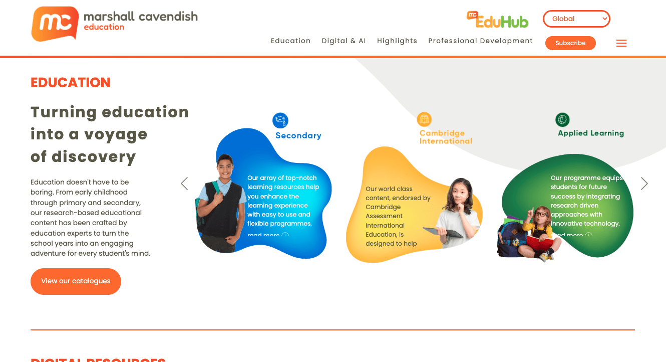 Marshall Cavendish Education came to us with a challenge: unify a 60-year-old global education brand under one cohesive digital experience. With operations spanning Singapore, Hong Kong, the United States, Latin America, and the Middle East, the site needed to serve diverse audiences while maintaining a consistent brand identity. We designed a sophisticated multi-region architecture that allows visitors to seamlessly access localized content, product catalogs, and resources tailored to their specific market and curriculum needs.
