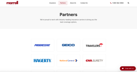 Built on WordPress with a custom Bootstrap theme, the site is fully responsive and optimized for speed. We integrated prominent trust signals throughout—partner logos from carriers like Travelers, Progressive, and Mapfre, client testimonials, and key metrics (115+ years, 4 generations, 100,000+ clients served). The 914Chat widget provides instant engagement, guiding visitors to the right coverage and capturing leads around the clock.